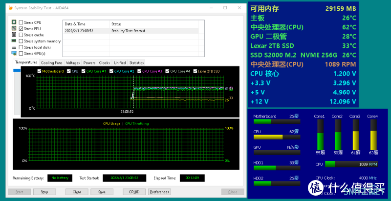 AIDA64 FPU 运行10分钟CPU温度也只在62度,这不仅是散热器的功劳,也不能忘记了安钛克星曜者DF800 FLUX机箱5个风扇的“默默奉献”,主板前后26度的温度可是一直没变过的哦。