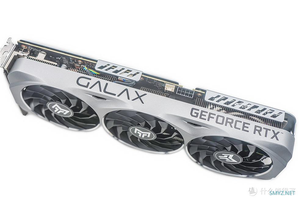 影驰RTX 3060 Ti金属大师的散热外壳采用了铝合金压铸工艺,而且表面经过磨砂处理,自带哑光效果,正面的金属质感视觉效果很不错,而且颜色上和白色反差不大。散热官方命名是寒光星,拥有三个9cm带11片三折扇叶的散热风扇,支持智能启停技术,在低负载的情况下风扇停止转动。