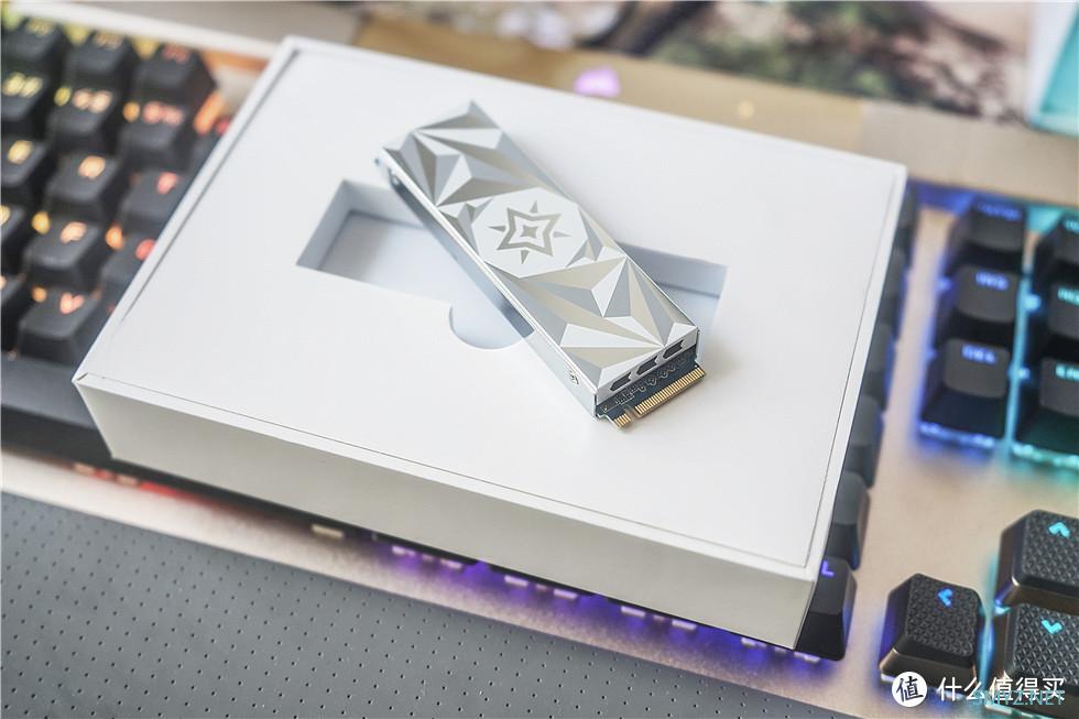 影驰星曜X4-1T自带镜面亮银高光+亮银配色和多重印丝工艺设计的厚实铝制散热片,散热片正面中间有星耀的logo。