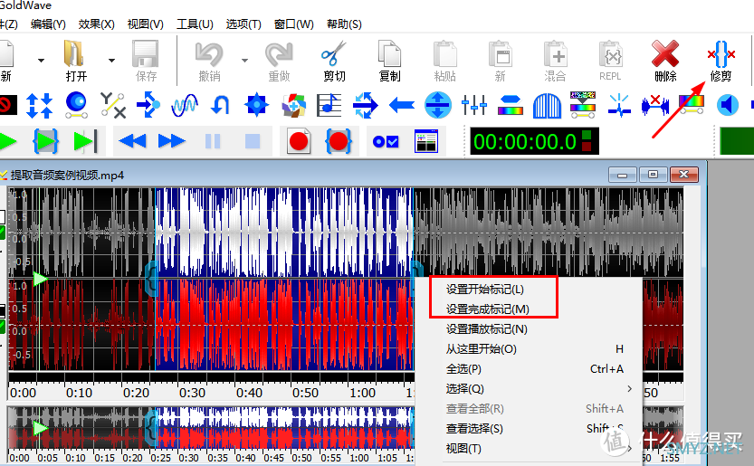如果仅需要提取整个视频的音频,这一步骤可以跳过。但是我们往往需要视频的部分音频,这时候我们通过修剪即可完成。首先在波形上点击鼠标右键设置“开始标记”(开始段)和“结束标记”(结束段),最后点击“修剪”按钮即可。