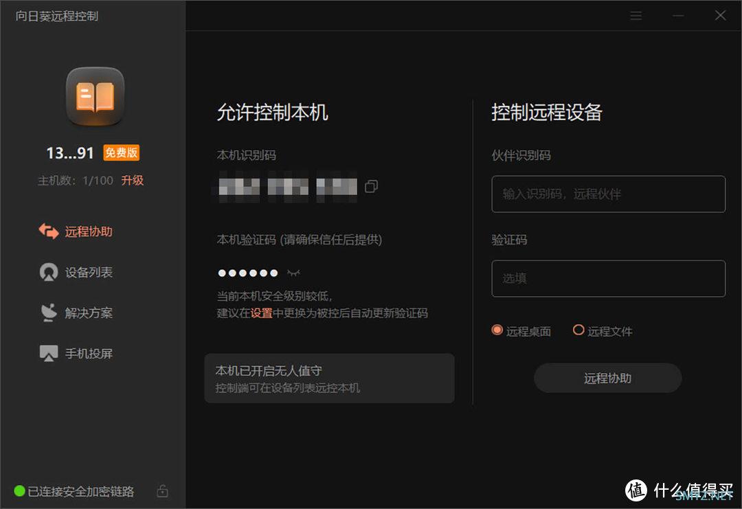 打开PC端的向日葵远程控制,同一设备处于同一网络下的话可以自动扫描到,如果异网连接的话需要注册并登录同一账号或者通过识别码来连接,然后我也建议大家将无人值守开启。