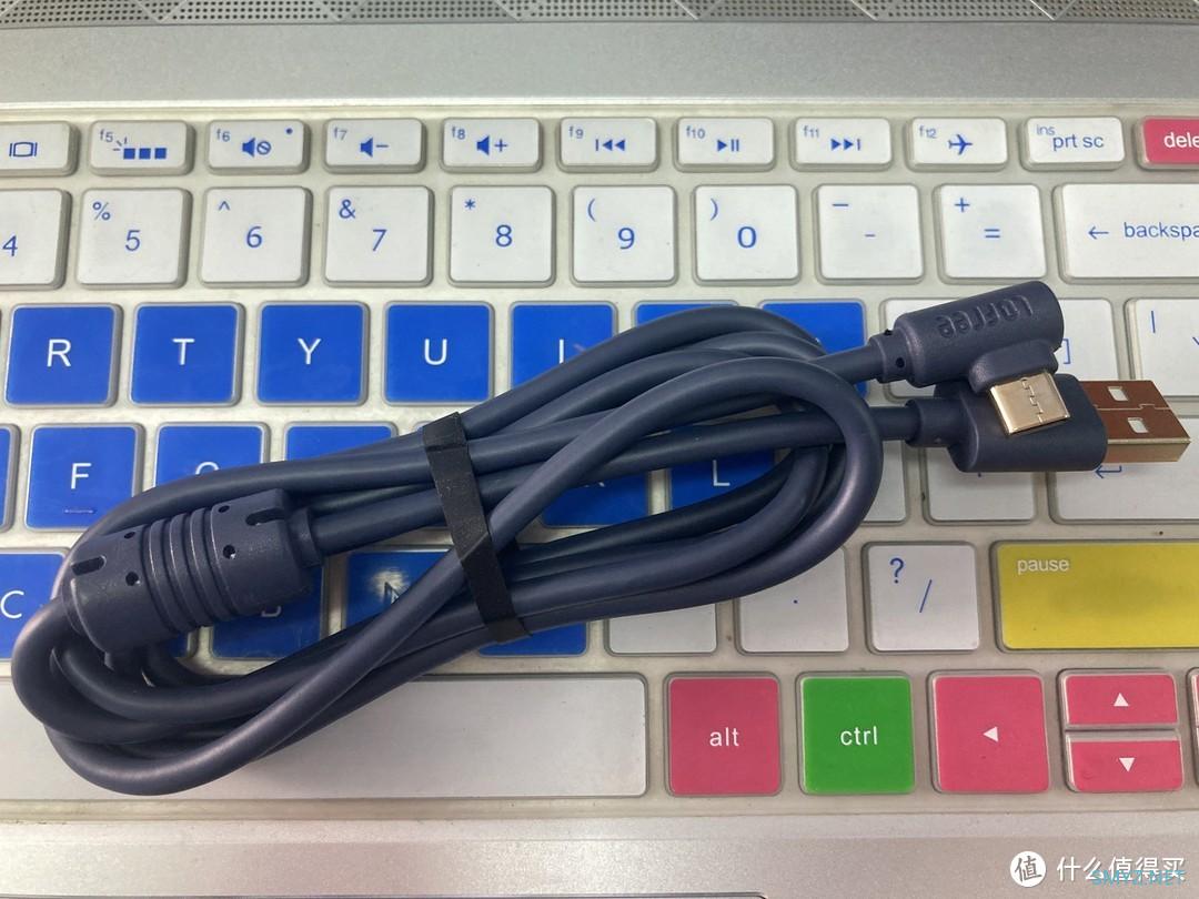 Lofree洛斐小翘配备的Type-C线C端的L型设计很友好,方便不同方向的插入,以及方便对线材的整理收纳,让桌面更舒适、整洁。线材较粗很扎实,软硬适中,但是收纳带要是换成魔术贴就是更好了。