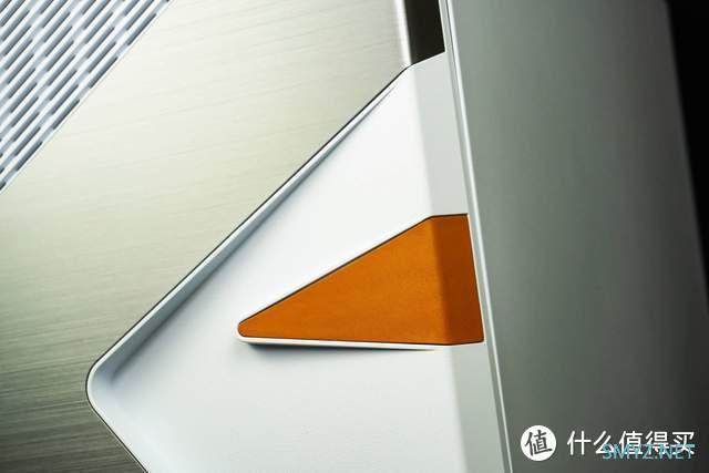 区域特写给到这块特显眼的橙色三角部分。机箱面板普遍采用金属、塑料设计,这一块采用皮质设计就非常耐人寻味。这块SSS级小牛皮尽显档次,搭配周边的金属拉丝面板,整体倒是动静结合,体现出静谧与灵动。
