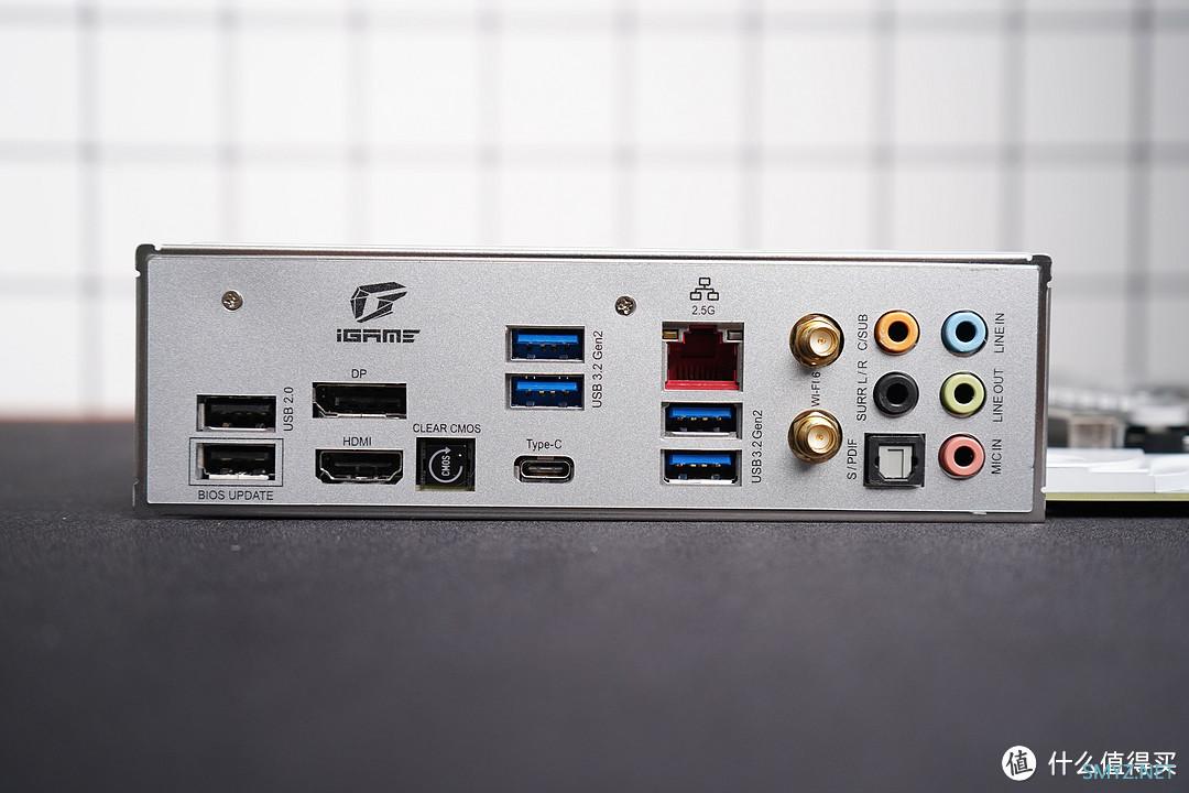 ▼最后就是简单过一下七彩虹 iGame Z690D5 ULTRA V20的I/O部分,在视频接口方面是标准的HDMI+DP组合,网络接口则标配了2.5G规格,并且预留了WiFi6天线部分(内置WiFi6无线网卡)。USB接口就比较丰富了,两枚USB2.0接口(其中一枚支持BIOS升级),四枚USB3.2 Gen2标准的Type-A,以及一枚USB3.2 Gen2x2标准的Type-C。
