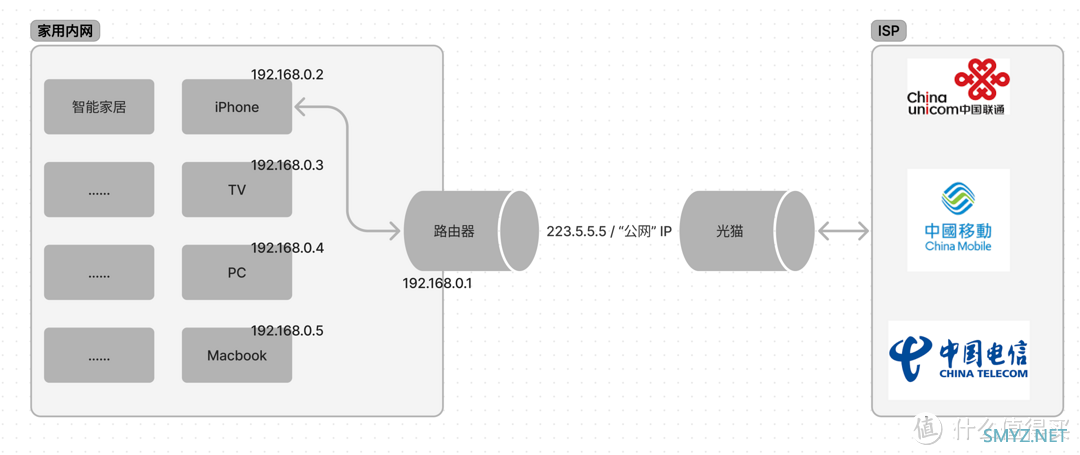 因为我国目前 IPv4 地址比较贫乏,所以运营商经常会做一层操作(NAT),将分配给家庭的地址改为运营商内部的“内网地址”,这就会导致在公网上是找不到家庭具体设备的,原理和家用路由器隔开了两个网络类似。