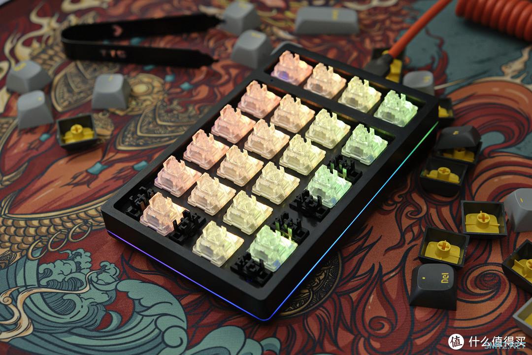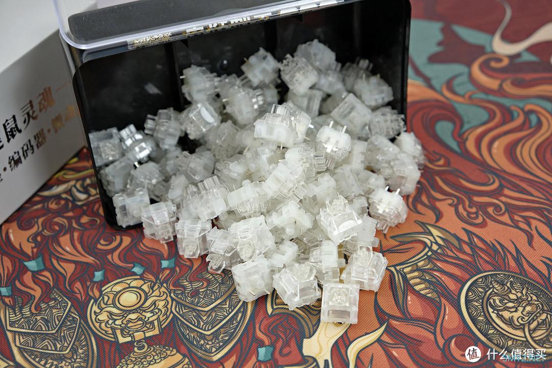 几乎全透的上盖和轴心,加上聚光镜对灯光效果的加成,TTC冰静轴V2宛如一个个小巧的冰雕,在灯光的映衬下显得晶莹剔透,美不胜收。