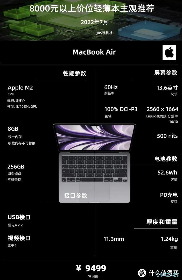 刚上市不久的M.2款MacBook Air,更换了新的刘海屏模具,边框控制比上一代有明显的改善。M2处理器的性能比M1有所进步,但提升幅度并不算大,9499元首发价个人觉得稍微贵了点,可以等降价或者补贴。