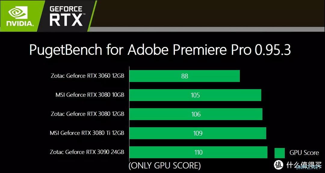 GPU 分数是 GPU Effects测试和 H.264 导出测试结果的平均值,基准是以NVIDIA GeForce RTX 3080 10GB为100分参考基准: