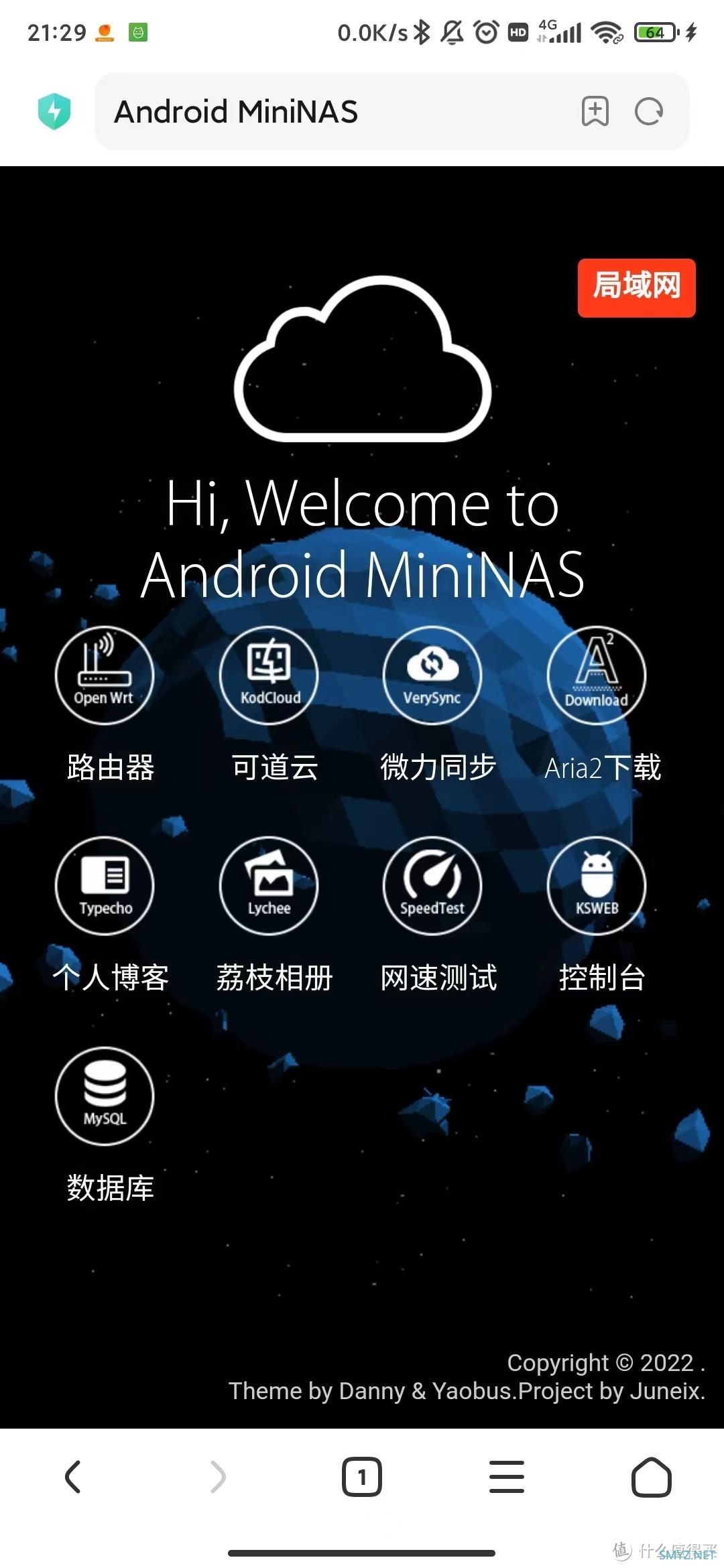 创建好typecho文件夹后退出数据库后台。在同一个局域网的另一个设备(手机或者电脑)浏览器地址栏输入主机地址:8080(如:192.168.31.16:8080),进入Android MiniNAS系统,切换到 局域网。