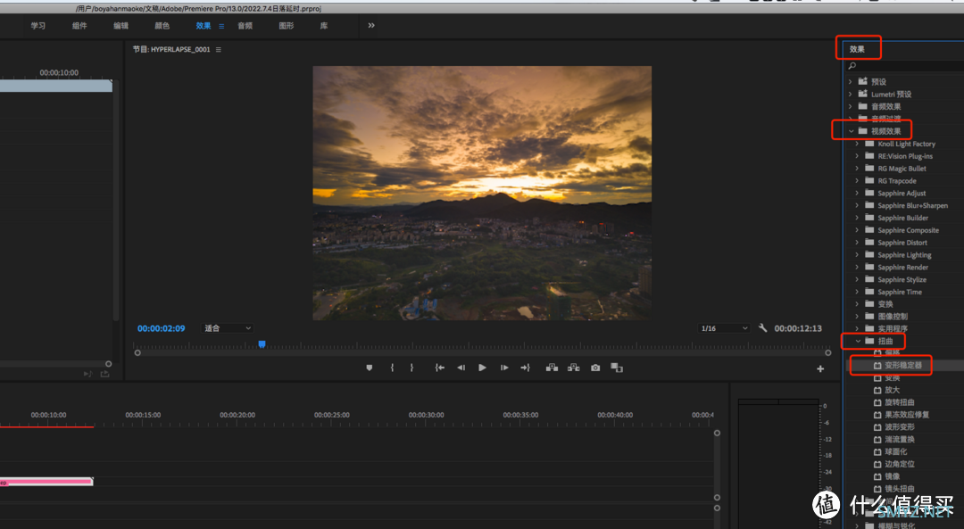 将前面的视频导入PR以后,直接选择效果-视频效果-扭曲-变形稳定器拖到视频上就行了