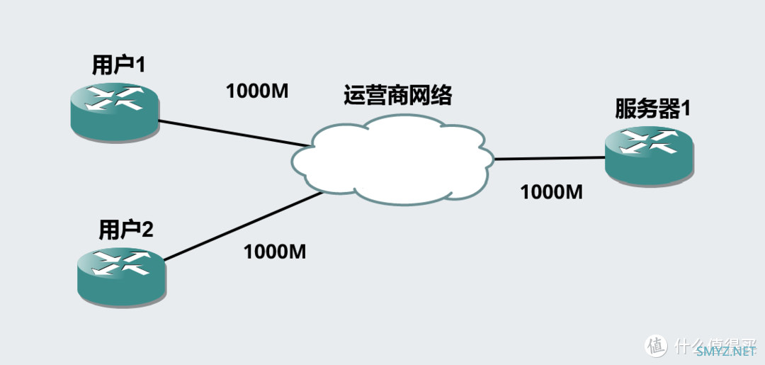 好了,现在,用户1、用户2、服务器1,全部都有1000M的带宽。这没问题了吧。假设运营商网络内部没有任何拥塞。