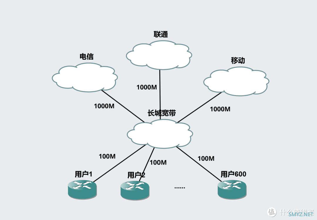 在完美的情况下,用户1能够以1000M的速度访问到服务器1,然而,由于运营商的传输网络的实际情况,基本上都不太可能跑到满速,更别说还有可能是跨了网络,比如说从电信到了联通、从联通到了移动之类的。还有从国内的网络到了国外的网络(hmmmmm……)