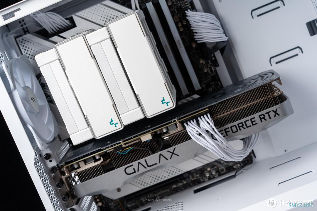 机箱内部布局,白色的九州风神冰立方AK620和3080TI金属大师是最显眼的