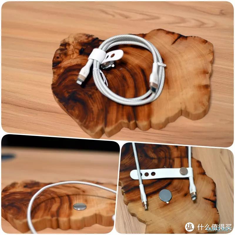 细节方面,有个贴心的聪明的磁吸扣,可以实现线材在桌面的固定,而且还带了束线带,方便用户的收纳,确保能够提供整齐的桌面,这一点对于有点强迫症的我来说确实方便不少。