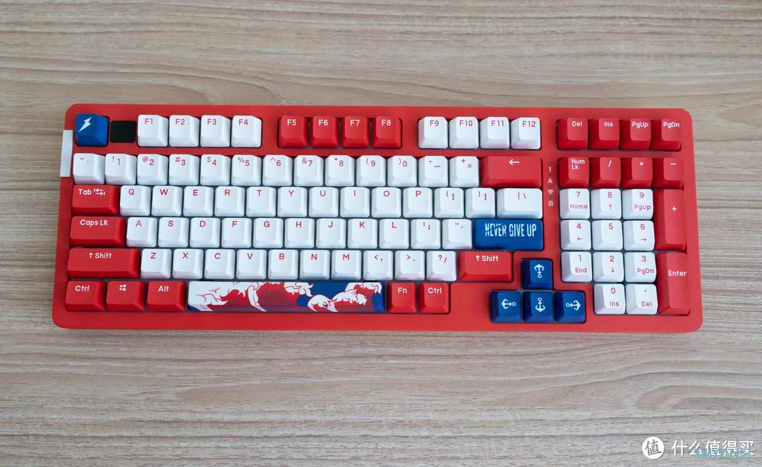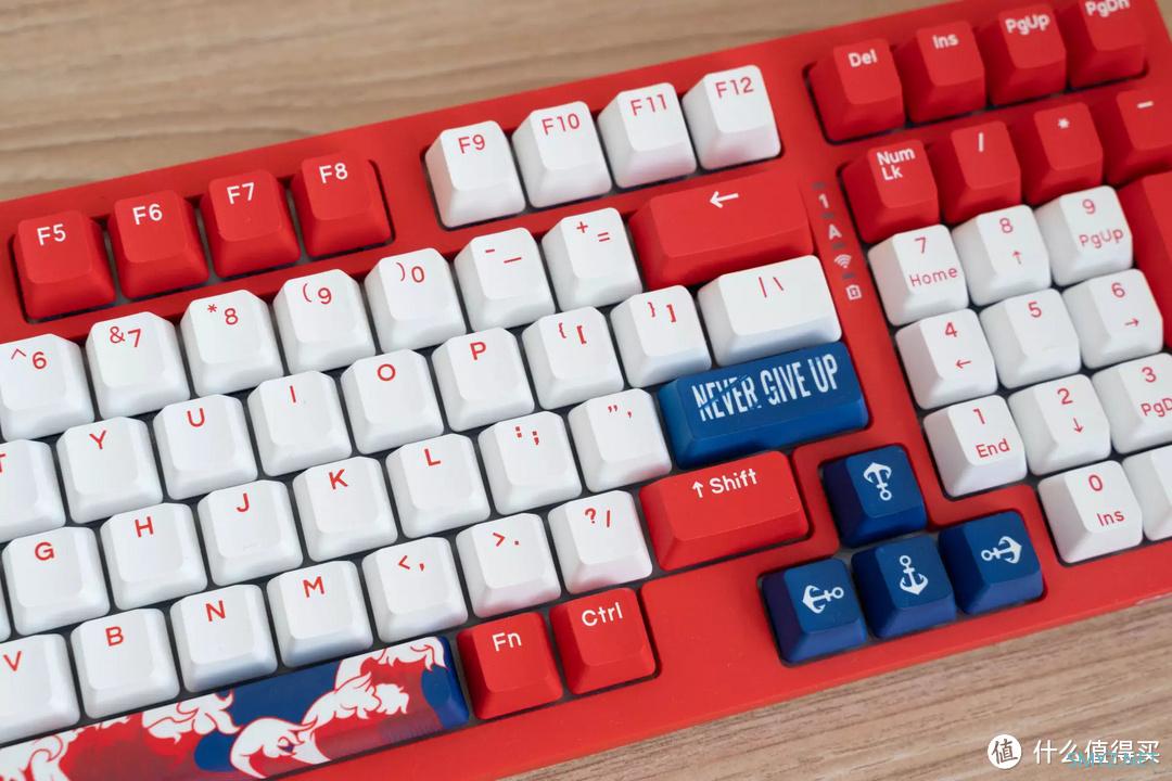 配色方面,“乘风破浪”以红白蓝三色搭配,白色底盖,红色上盖,键帽以红白两色为主,部分功能按键采用蓝色键帽进行点缀。