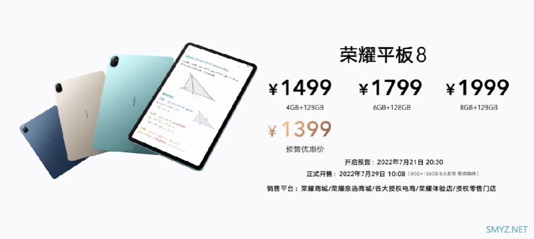 这个就是荣耀平板8,售价1499元起(首发1399元),推荐6GB+128GB的中配,售价1799元,顶配1999元。