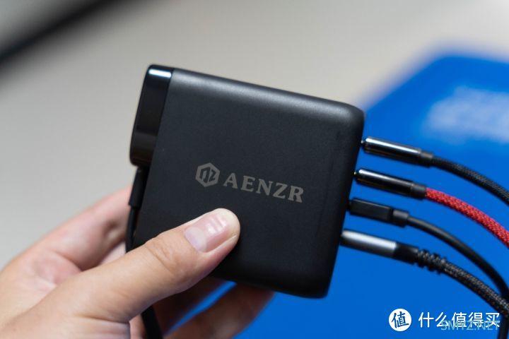 充电器拿到手上的感觉还行,体积控制的十分不错,放到桌面或者包中携带都不会太占位置,尤其是质感摸起来十分舒服,这得益于充电器采用了磨砂的工艺,融入奢华的黑色,整体好看不少。充电器上有AENZR的品牌丝印,颜值方面还是可圈可点。