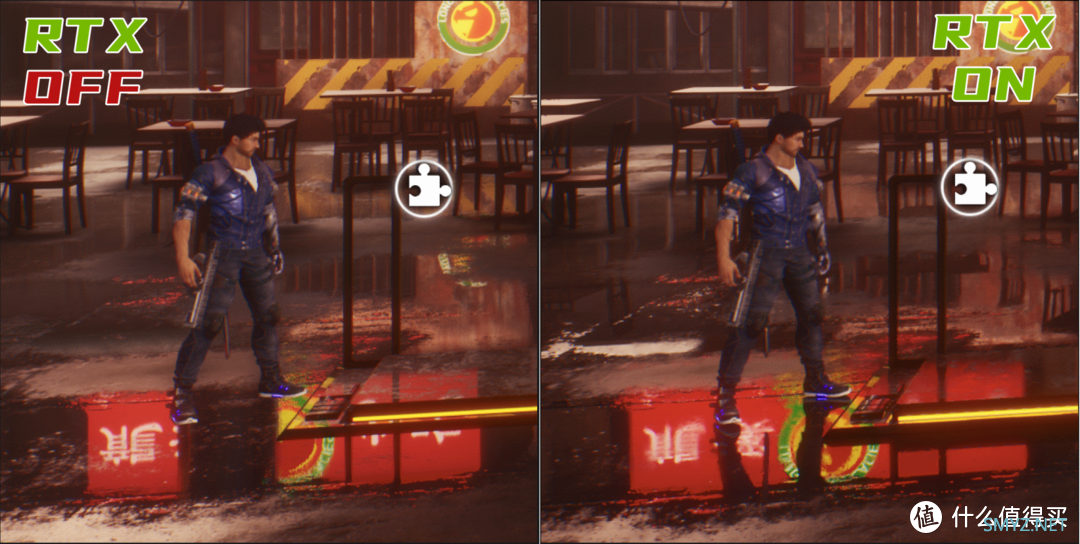 通过前三张图的对比可以发现,光线追踪可以让水面反射的效果更加锐利、更加真实。比如图一图二人物、文字的倒影,未开启光线追踪时,边界模糊不清,远景倒影甚至糊成一团;比如图三箱子装饰灯的细节,只有在开启光线追踪后才能清晰可见。