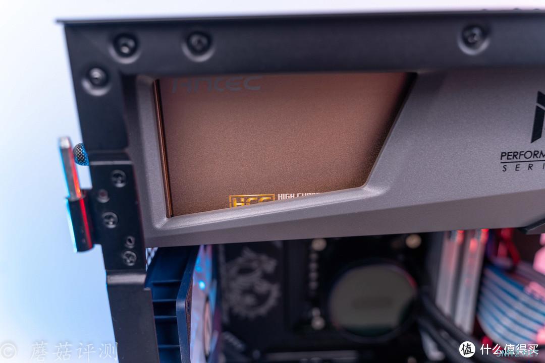 ▼电源用的是安钛克的HCG1000金牌全模组电源,电源的侧面颜值非常漂亮,有铝合金的外壳包裹,表面还通过阳极氧化做出了粉色,并有细腻的喷砂处理,质感很棒。