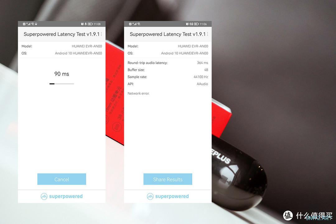 另外延时问题也是游戏爱好者所重点关注的地方,OnePlus Buds Z2提供了理论延时,即在自家手机的Color OS系统下游戏模式延时为94ms,H2/O2 OS系统下游戏模式延时119ms,标准音频模式下AAC 287ms/SBC 286ms。我这里使用的是华为手机进行测试,先对手机内部的自身延时进行了测试,数据结果为90ms,连接OnePlus Buds Z2测试蓝牙耳机的延时,最后减去手机本身的延时速度就得到了这款耳机的延时效果364-90=274ms,与官方数据基本相同。