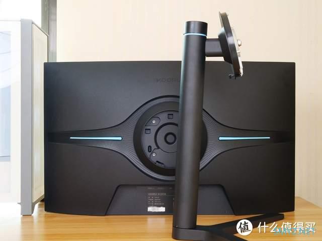 值得一提的是支架质感很不错,全金属材质配合黑色磨砂喷漆,辅以孔雀蓝色的点缀,与显示器后方的同色装饰条交相呼应,大大提升了显示器的档次感。做工方面也可圈可点,缝隙均匀,结构紧凑,完全没有普通显示器的那种松垮感,与显示器背部更是采用两固定接口加上三连接卡口5个点位的方式固定,十分稳固。安装完成以后还会形成天使之眸的形状,也是显示器中少见的走心设计。