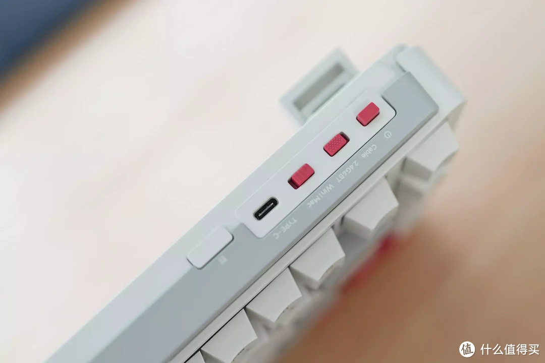除此之外,还有三枚红色的按键,一个是电源键,另外两个是蓝牙连接以及2.4G无线连接。特别,这款键盘为MAC进行了深度的优化,体验很赞。