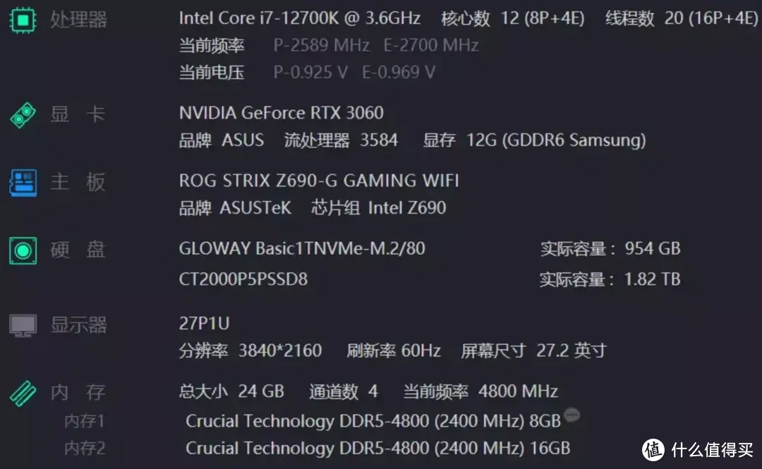 装机过程就不一一介绍了,不过还是简单介绍一下这次的装机硬件,i7-12700K处理器,华硕 ROG STRIX Z690-G GAMING WIFI主板,华硕TUF RTX 3060 O12G GAMING( 12 GB / 华硕 )显卡,华硕ROG STRIX飞龙 二代 360ARGB散热。