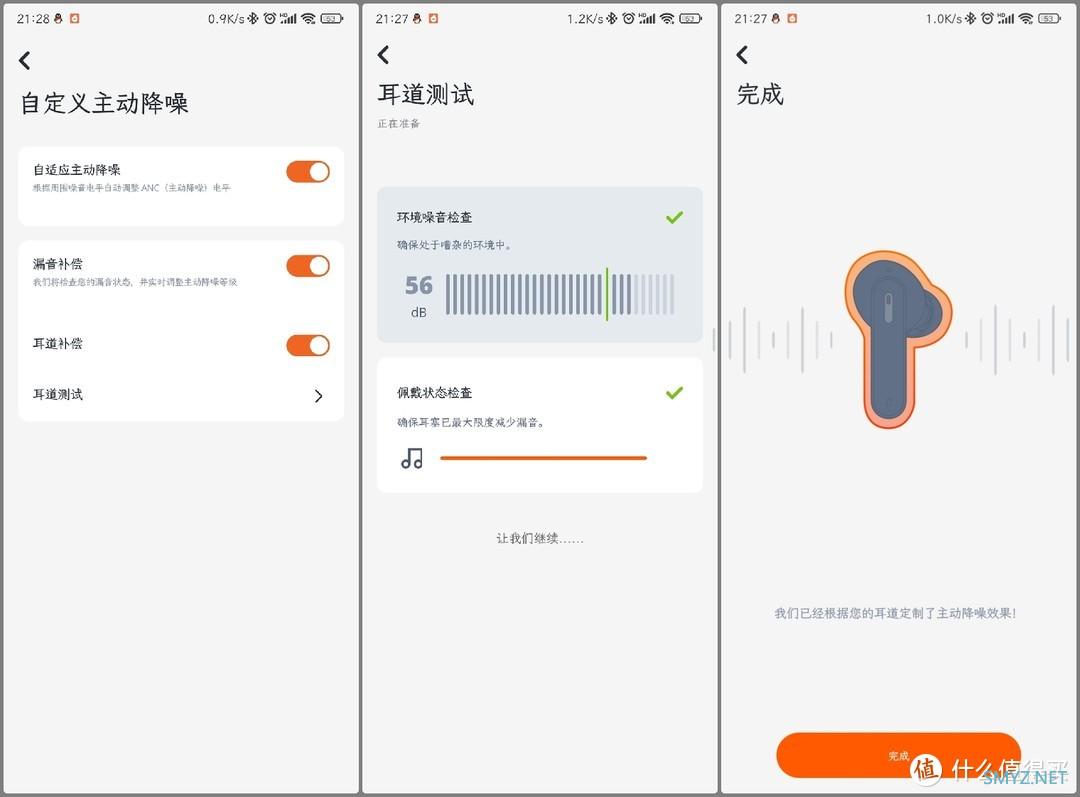 除了可以自适应主动降噪模式,我们还能进行多级手动降噪调节,而且还能通过“耳道测试”功能,结合周围的环境噪音和个人耳道定制主动降噪模式,以便带来更好的降噪效果。