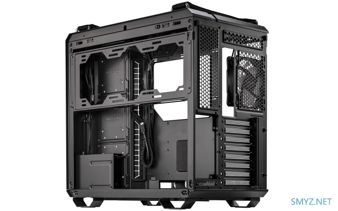 机箱整体尺寸为285 x 450 x 446mm,重12Kg,采用模块化设计,拥有超过25个可拆卸的零部件,兼容ATX、Micro-ATX、Mini-ITX主板。机箱内预留了90mm的理线空间,同时提供一个3插槽的垂直显卡支架,以及VGA支架,这更有利于用户选择垂直还是水平放置显卡。支持最多400mm长的显卡、163mm的CPU散热器,以及200mm的电源。