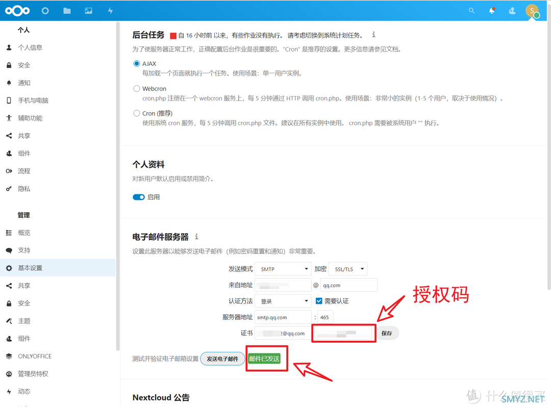 ????然后回到Nextcloud的页面。还是在“设置”里点选左侧“基本设置”之后,在右侧的“电子邮件服务器”里面设定邮件服务器: