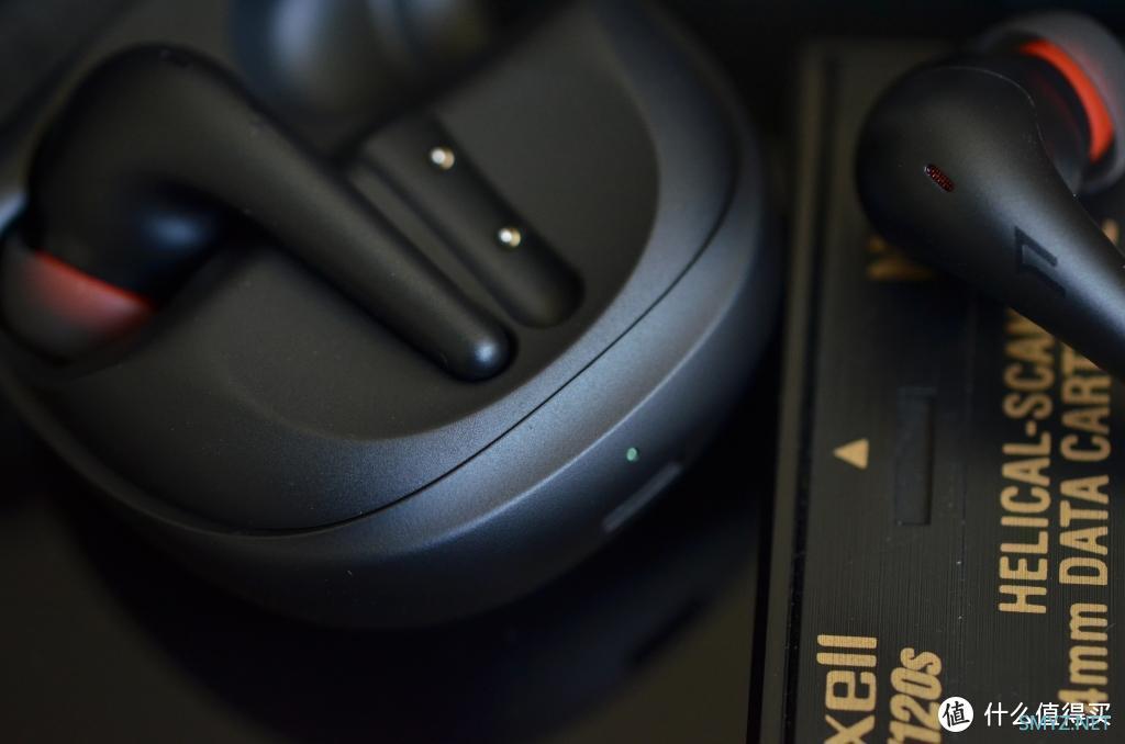 另外AERO的充电触点转移到了耳柄上,充电接口是最常用的C口。在充电接口的下方有一个LED状态指示灯。另外这款充电器还支持Qi无线充电,不过首先得有一个无线充电器。