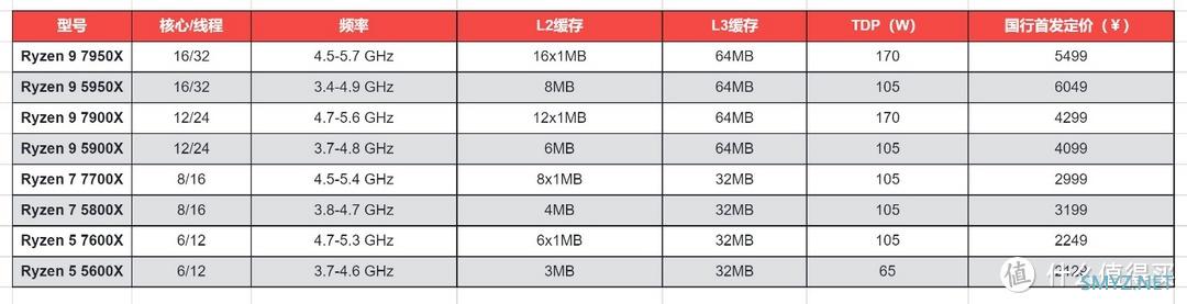 “锐龙7000处理器带来了哪些变化?关于这个可以看上一篇内容,有详细说明,这边就不再赘述。这次主要补上锐龙9 7900X和锐龙5 7600X的性能测试,方便参考了解性能区别。首先还是处理器的规格,这一代除了内核设计,整体处理器大的规格/设计变动并不大,处理器的区分基本跟上一代类似,所以锐龙5 7600X也是用来替代上一代【性价比】型号锐龙5 5600X.