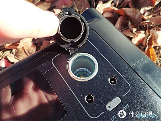 右边是车充点烟口,最大输出10A的电流,车充点烟口的下方是两个DC接口。点烟口带胶盖的设计也为这个大开口带来了有效的防护。