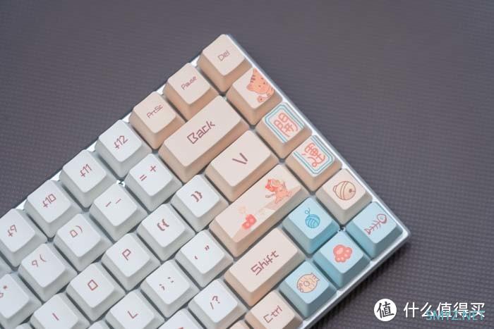 键盘主要有白和粉的拼色。这两种双拼色在一起非常的湿润,慵懒。可以看到键帽上不仅有常见的字符,还有一些图案在上面。如小萌虎,沙滩和日出等等。