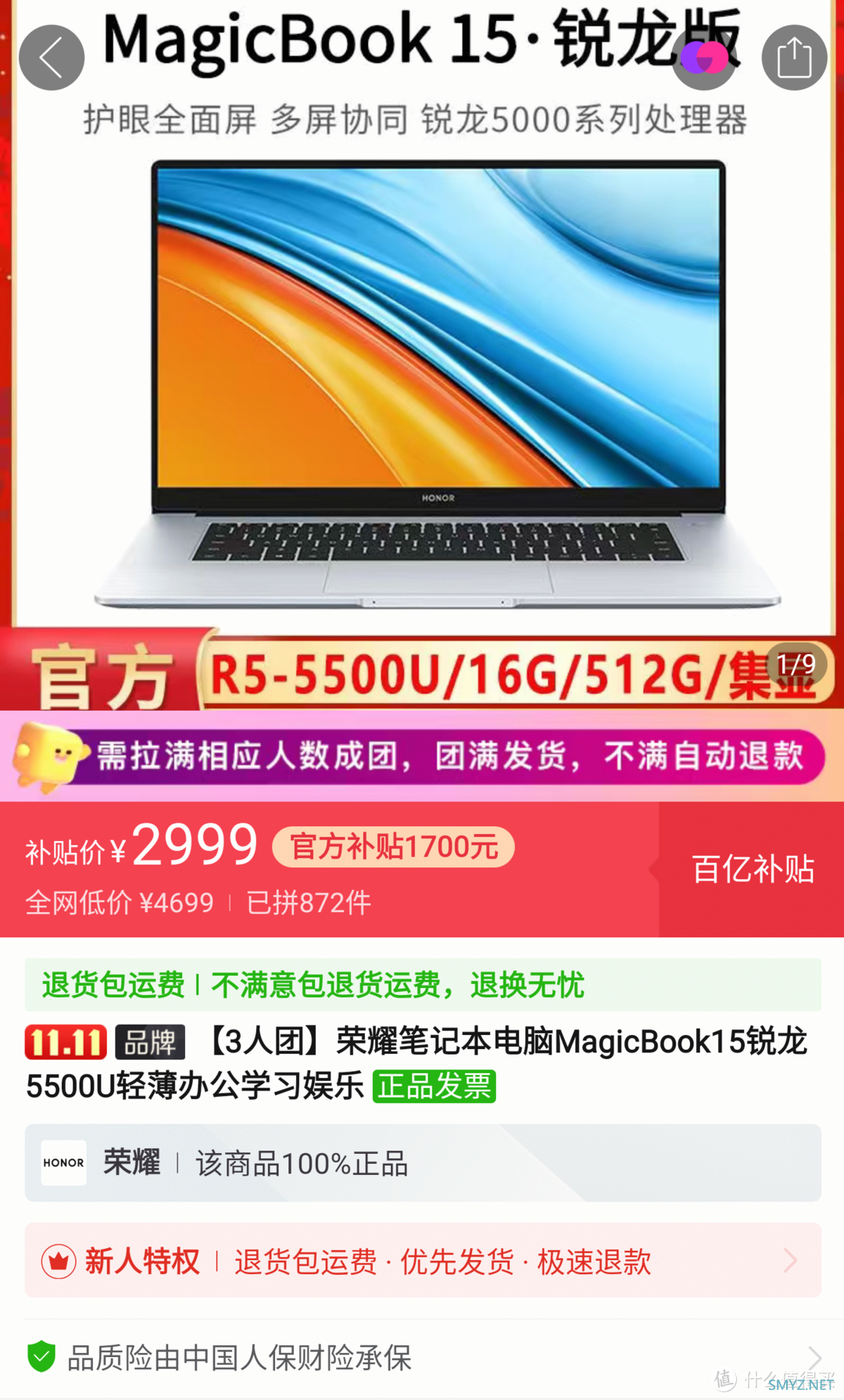 【3人团】荣耀笔记本电脑MagicBook15锐龙5500U轻薄办公学习娱乐2999元HONOR 荣耀 MagicBook15笔记本电脑,外观方面,采用了钻切蓝边的设计,开合盖时,小蓝边会闪动,三面5.3mm微边框全面屏,而且通过了德国莱茵低蓝光认证。最厚处为16.9mm,重量为1.53kg,拥有指纹识别和隐藏式摄像头。升级了备受好评的多屏协同,最高支持3个窗口。配置方面,荣耀MagicBook搭载全新第十一代酷睿i5-1135G7处理器,16GB内存,512GB固态硬盘,配备65W便捷式充电器,支持对荣耀手机的超级快充,外出携带一个充电器就足够了。散热方面,全系风扇采用了鲨鱼鰭高密度纤薄拼多多去购买