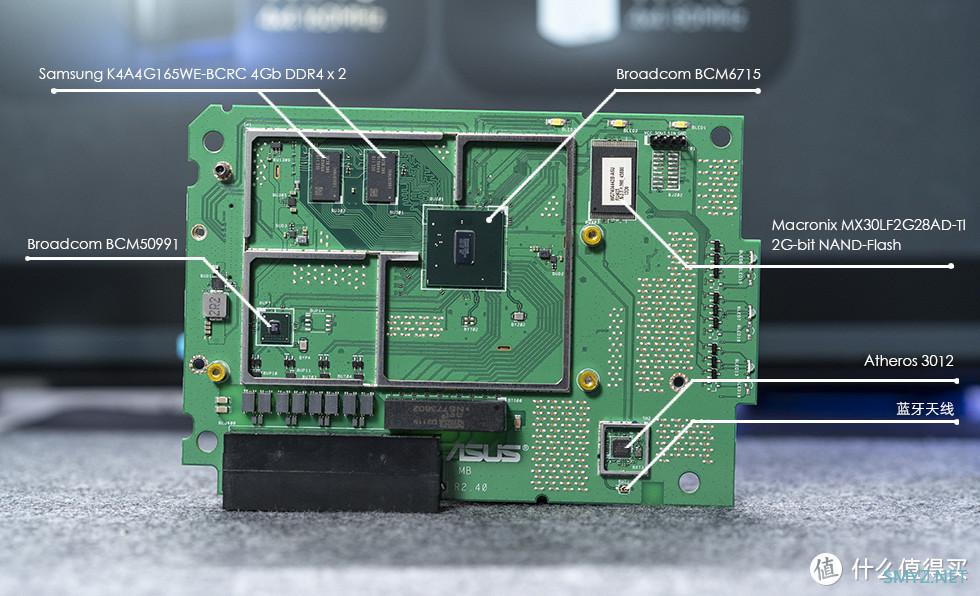 主板中央位置为 Broadcom BCM4912 处理器芯片,6nm 四核 2.0GHz 64位 PC 级处理器,拥有 runner 以及 rangeboost+加速引擎,CPU的左右两侧分别为1G内存,来自三星的K4A4G165WE-BCRC 4Gb DDR4,以及Macronix MX30LF2G28AD-TI 2G-bit NAND-Flash 256MB RAM。左下角搭载可一颗BCM50991,主要用于2.5G有线网络。右下角为Atheros AR3012芯片,下方带有蓝牙天线。