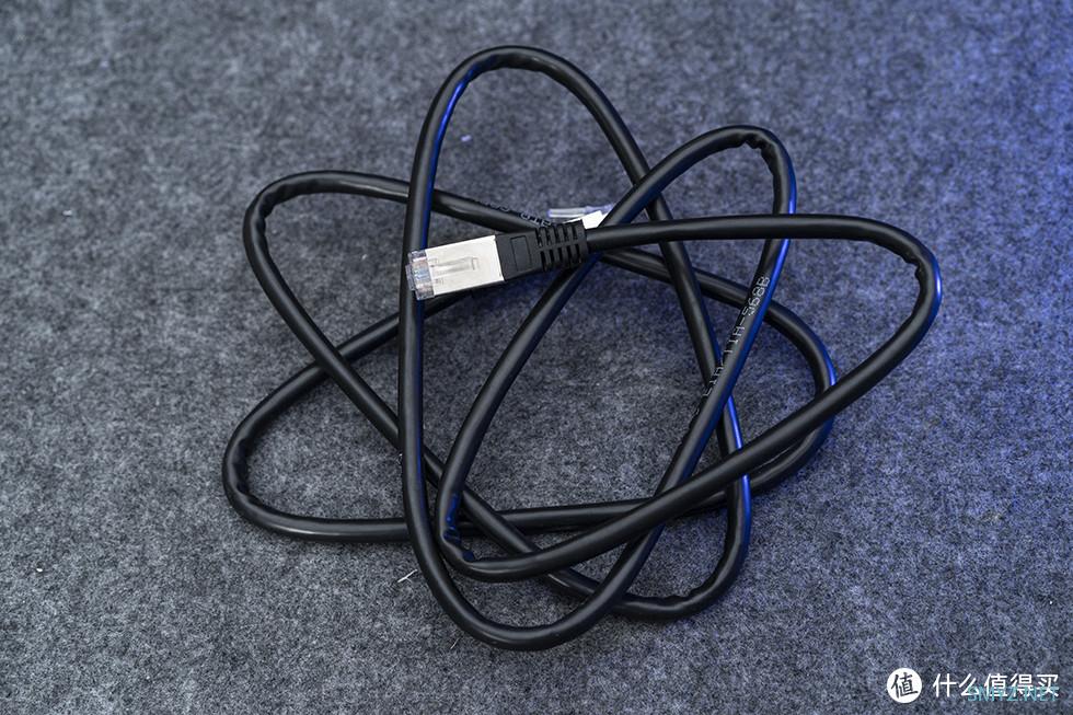 随机附带的电源规格为19.5V 2.31A,最高输出功率为45W,同时还有一条带金属屏蔽头的超六类网线。
