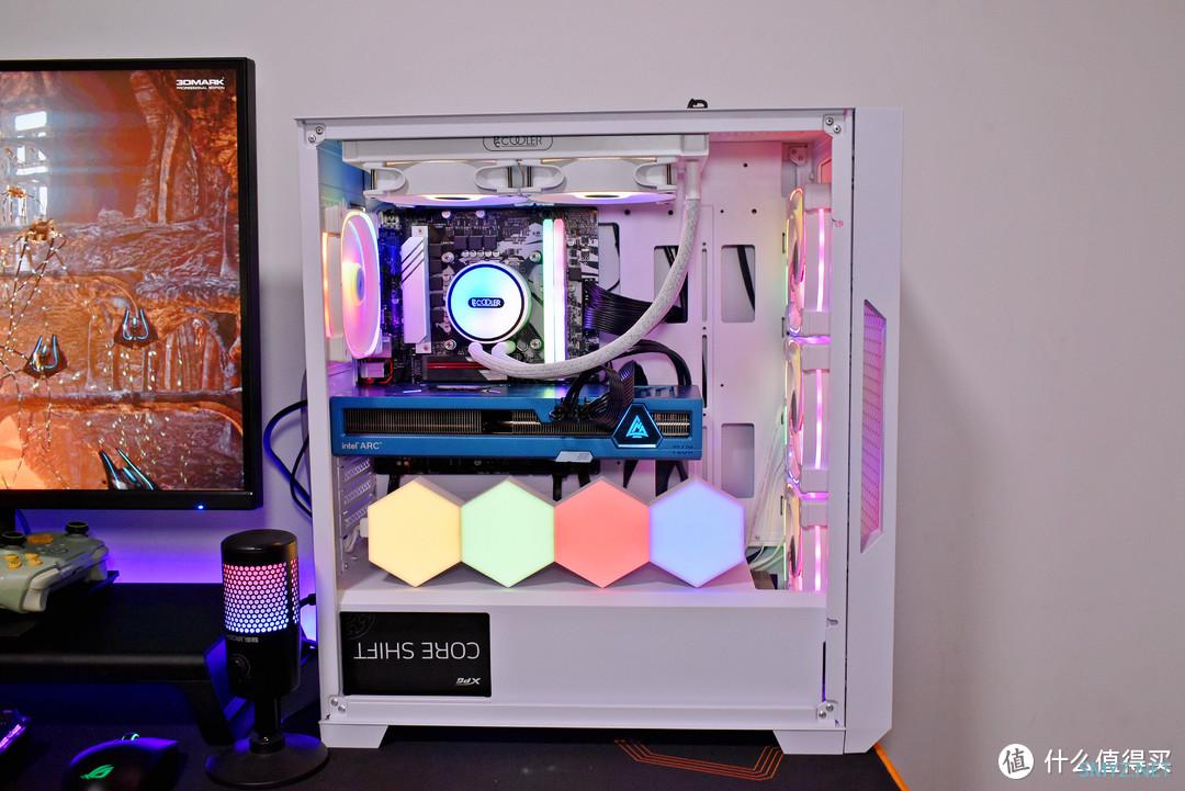 显卡上机,GUNNIR Intel Arc A750显卡给我的惊喜还不小,一道蓝色光芒闪过,通电效果真的顶。