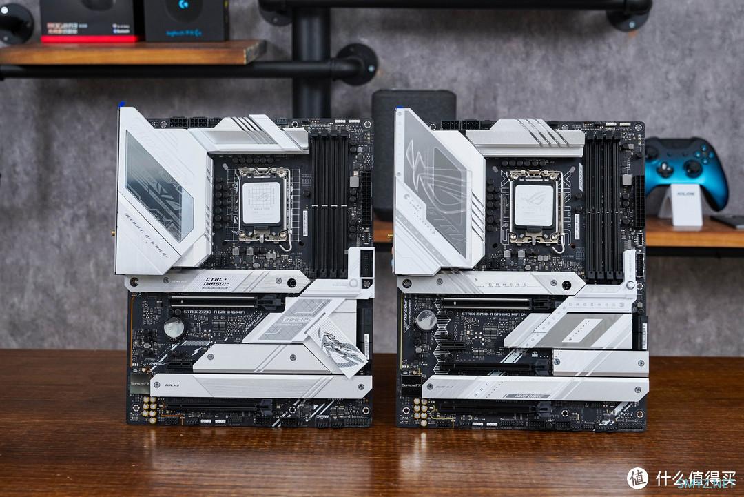 两张主板的外包装除了颜色和图案不同之外,内里的配件基本是不变的哈,这里就偷个懒,直接看下主板本体有什么不同点。下图左是ROG STRIX Z690-A吹雪,右则是新推出的ROG STRIX Z790-A吹雪。主板的板面设计还是有变化的,但是整体外观变化很大吗?个人觉得并不这么认为,有变化但是差距不大,只能是这么形容。