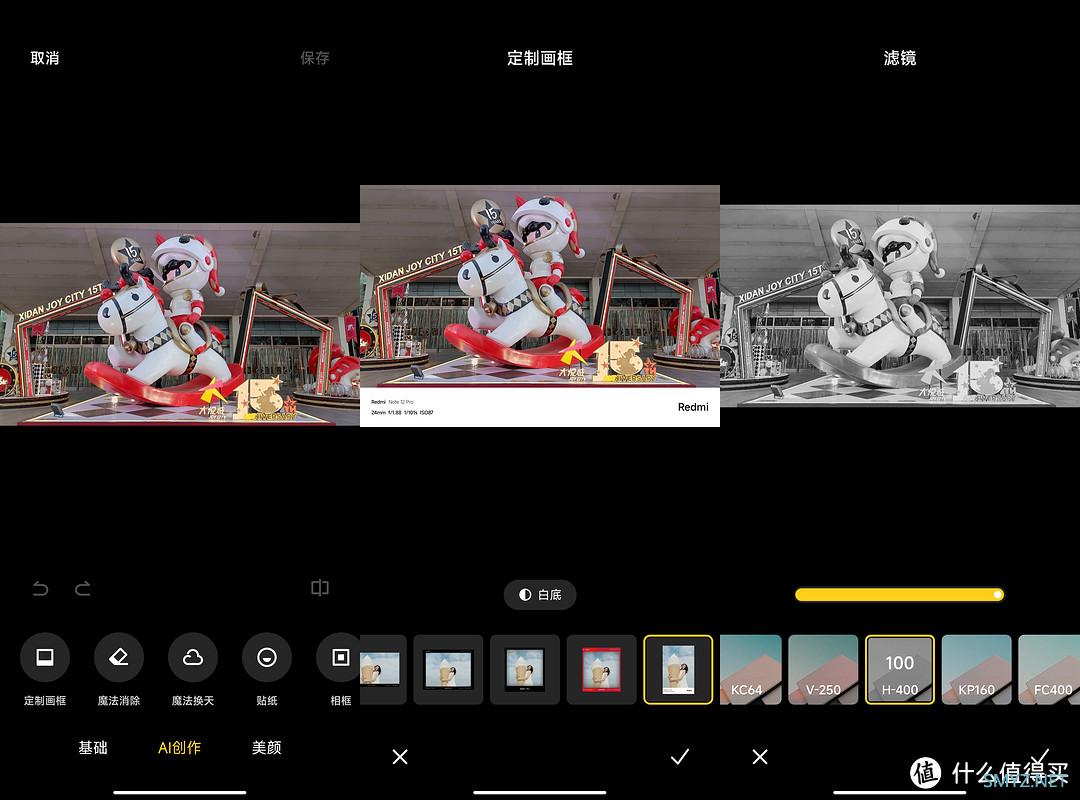 手机相册内置的贴心功能同样具有很多可玩性,以满足大家发朋友圈个性化的需要。如“AI创作”中可以加入带有拍摄信息的多种定制画框、魔法消除、魔法换天等功能,自带滤镜还有复古的胶片模式。