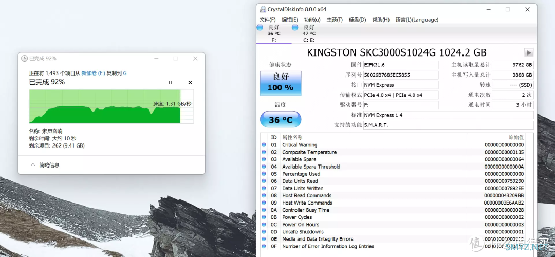 在安装主板自带的固态散热装甲后,写入时温度最高36度左右(颗粒温度),未出现严重掉速情况。