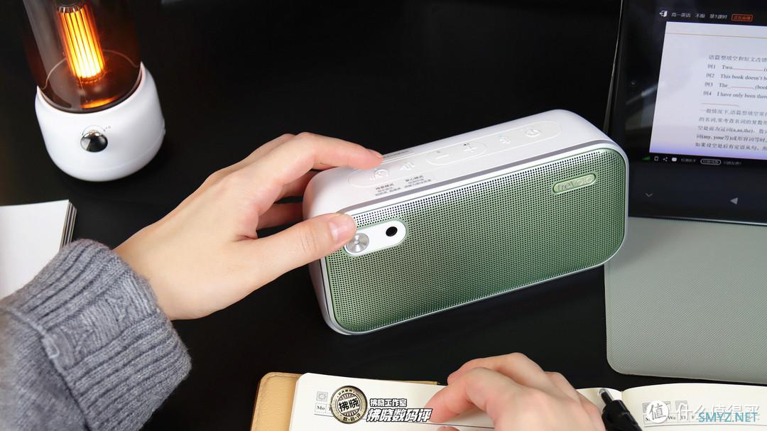 外观设计上,treVolo U语言学习音箱采用了极简风设计方案。官方为这款产品提供了“不焦绿、不困蓝”两款配色版本可选,除中网外的机身部分全部为白色,所呈现的双拼色效果也非常耐看。作为一款桌面级音箱产品,treVolo U语言学习音箱的机身尺寸非常小巧,其长、宽、高分别为174x95.34x81.36mm,加上仅为约760g的机身净重,很轻松就能将它装到背包里带走。