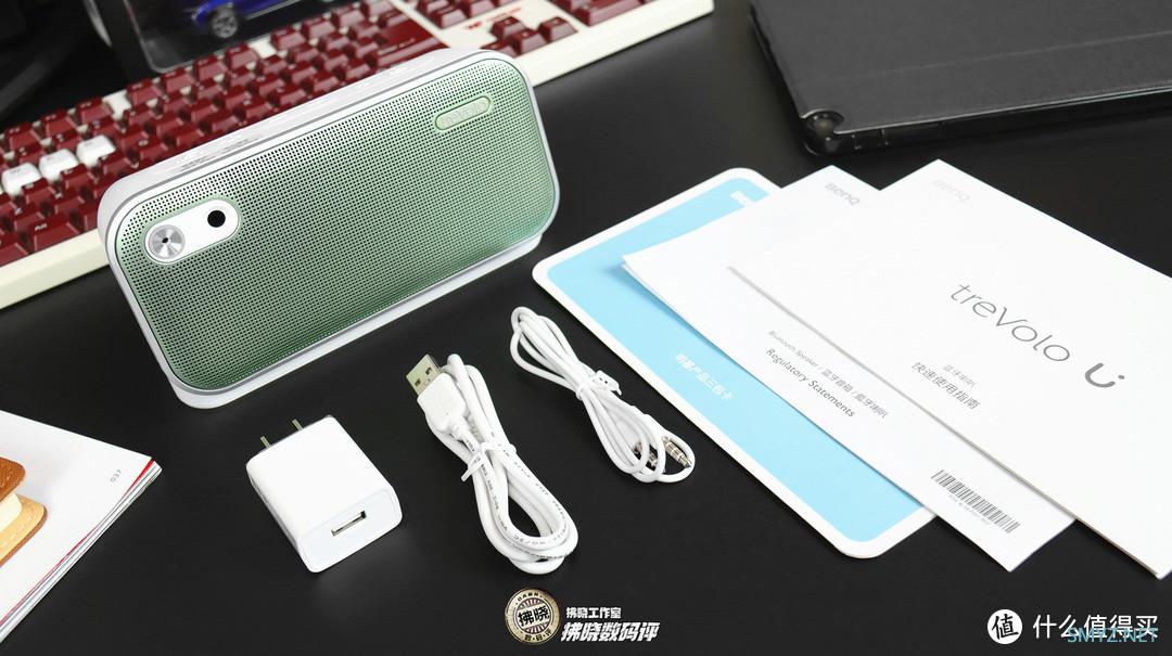 与市面上一些老牌音箱那硕大夸张的包装相比,treVolo U语言学习音箱的包装盒则要相对小巧许多。与机身大致相同的包装盒尺寸,加上极简风的设计,很符合当下消费者的审美要求。在配件方面,包装盒中除了音箱主机外,还附带有充电线、电源适配器、3.5mm音频线,以及快速使用指南和质保卡等文本。在各大小厂商秉承着“能省即省”的原则时,treVolo U语言学习音箱自带的这个电源适配器(充电器)就显得甚是贴心了。