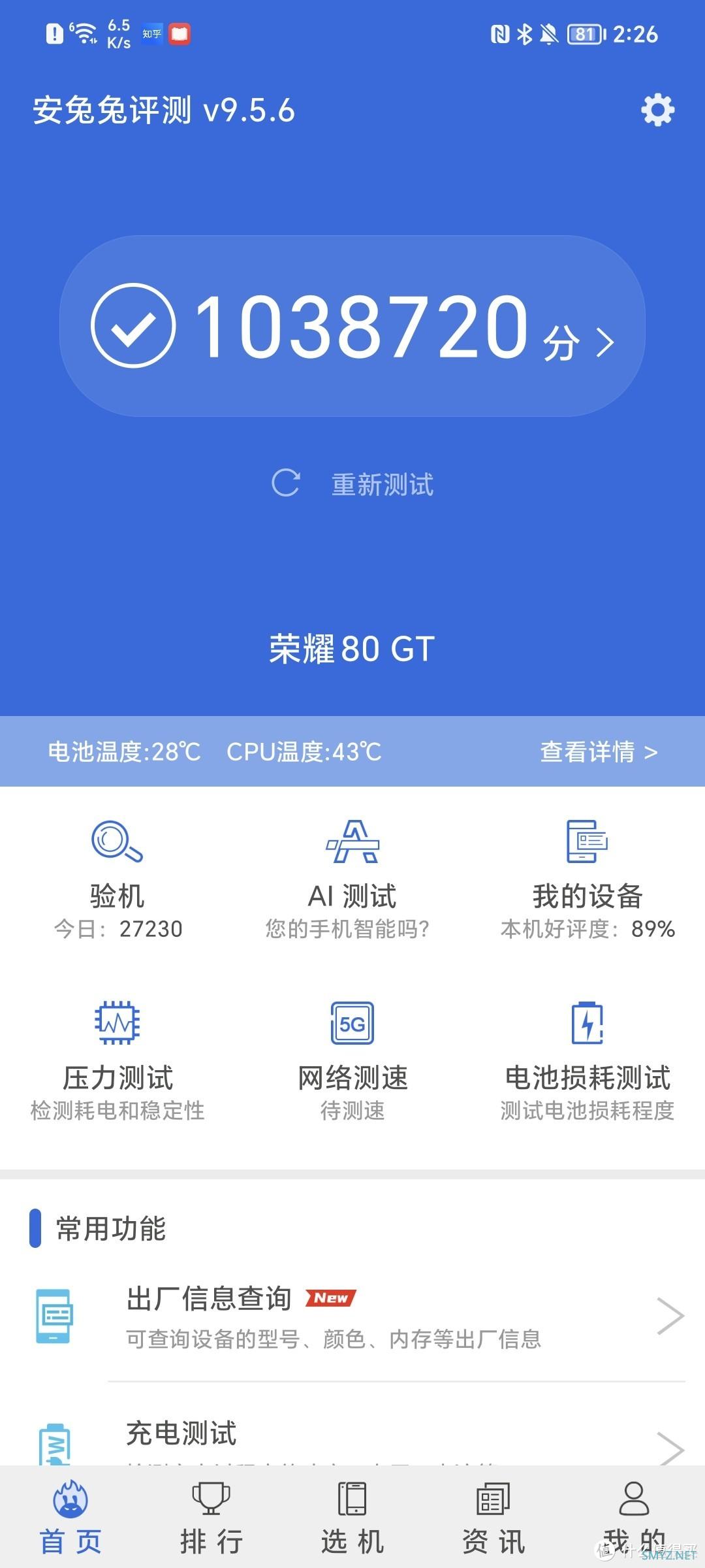 接下来,我们就要看看它的真实体验表现怎么样了?在安兔兔跑分测试中,荣耀80 GT可以跑出89万分的成绩。达到了目前顶级旗舰处理器的水准。