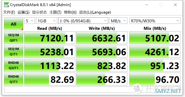CDM软件的算法基本能展现出硬盘的最大性能,从实测数据来看,达墨水瓶座的读写速度达到了7120/6632 MB/S,均超过了官方标称的速度,确实不负Gen4硬盘之名。