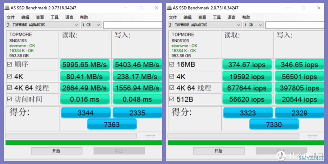 固态测试三剑客中的ASSD肯定也少不了,它的算法比较特殊,达不到硬盘的最大标称速度的,但比较贴近实际使用体验,而且这个量化的跑分非常容易让人上瘾,不管是速写速度还是IOPS的测试,ASSD都给到了超过7300分的高分,表现同样不错。