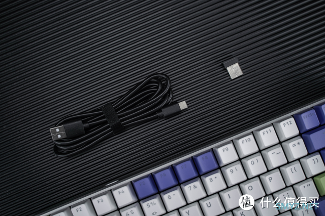键盘内部配有一张说明书,和一个塑料拔键器,拔轴器,以及一根Type-C接口的线材和一个2.4G的无线接收器。