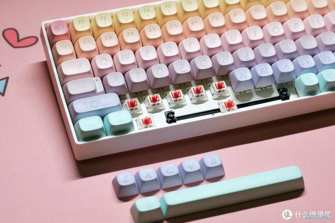 而作为一款支持全键热插拔的键盘,洛斐棉花糖自然也是可以轻松完成轴体替换,拆下键帽,可以看到此次装配的是来自佳达隆的G红Pro轴,出厂自带润滑,手感软糯,静音效果也不错,属于是一款很全面的轴体,再加上此次在PCB板和定位板中间增加了硅胶夹心垫,进一步消除了空腔音,即使是在很安静的环境下使用,也不怕吵到别人了。