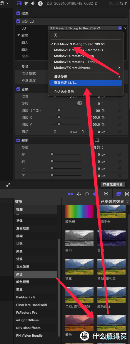 FCP选择右下方“效果”-“颜色”-自定LUT,拖入片段后右侧就可以“选取自定LUT”。