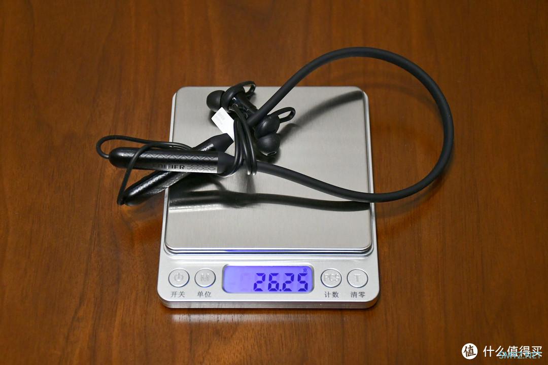 这款产品有黑、白、红3种色款可供选择,黑色款比较沉稳、百搭,而且在耐脏方面有优势。整个耳机的重量约为26.25g,这个参数在市面上一众颈挂式蓝牙耳机中处于上游水平,整体的佩戴体验非常舒适。